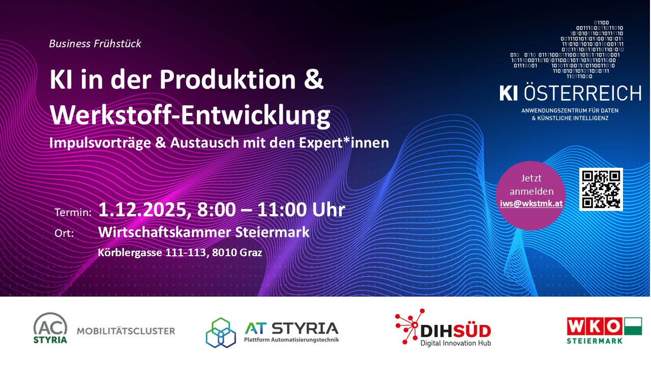 Wir laden Sie herzlich zum Business Breakfast "KI in der Produktion & Werkstoff-Entwicklung" mit AC STYRIA, DIH Süd und IWS / WKO Steiermark ein. Ab 08:00 Eintreffen 08:30 Begrüßung & Eröffnung 08:35 Impulsvorträge: „KI in der Produktion“ (Dr. Andreas Windisch, JOANNEUM RESEARCH) „Verwend >mehr lesen Zu diesem Thema erhalten Sie mehr Informationen als PDF28.11.25